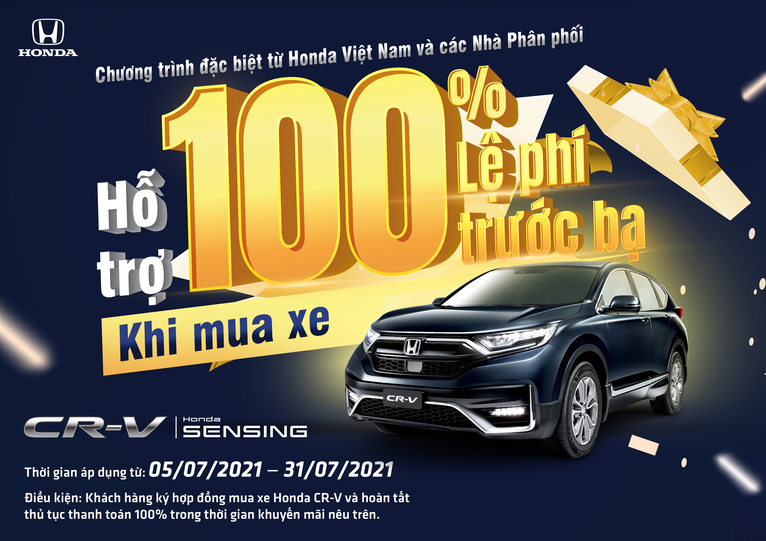 Với mong muốn nhiều khách hàng hơn nữa có cơ hội sở hữu và trải nghiệm mẫu xe này cũng như hỗ trợ một phần chi phí mua xe cho khách hàng trong bối cảnh đại dịch Covid diễn biến phức tạp, từ ngày 05 đến hết ngày 31 tháng 7 năm 2021, Công ty Honda Việt Nam phối hợp cùng các Nhà Phân phối ô tô Honda trên toàn quốc triển khai chương trình khuyến mại: “Hỗ trợ 100% lệ phí trước bạ xe Honda CR-V” với thông tin chi tiết như sau: