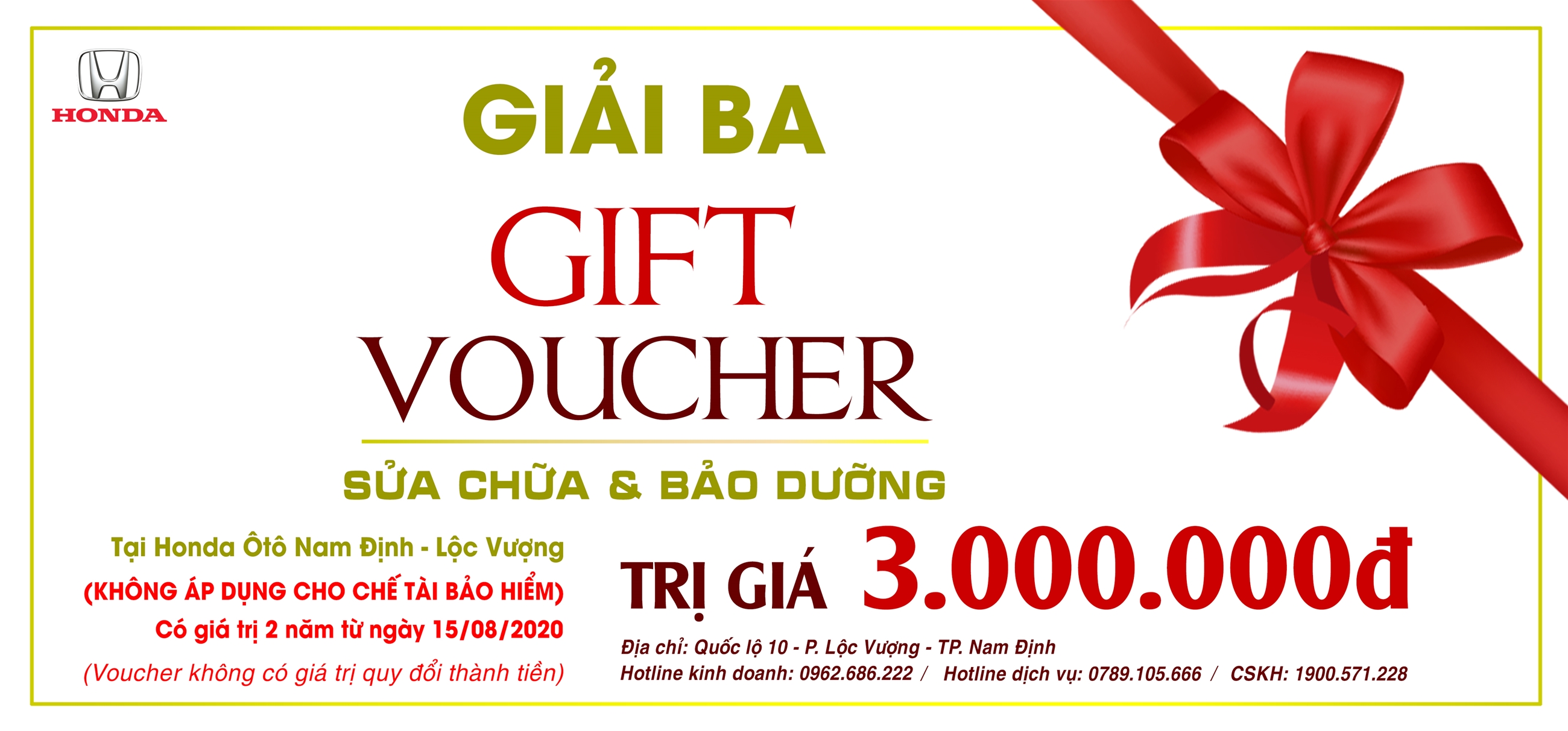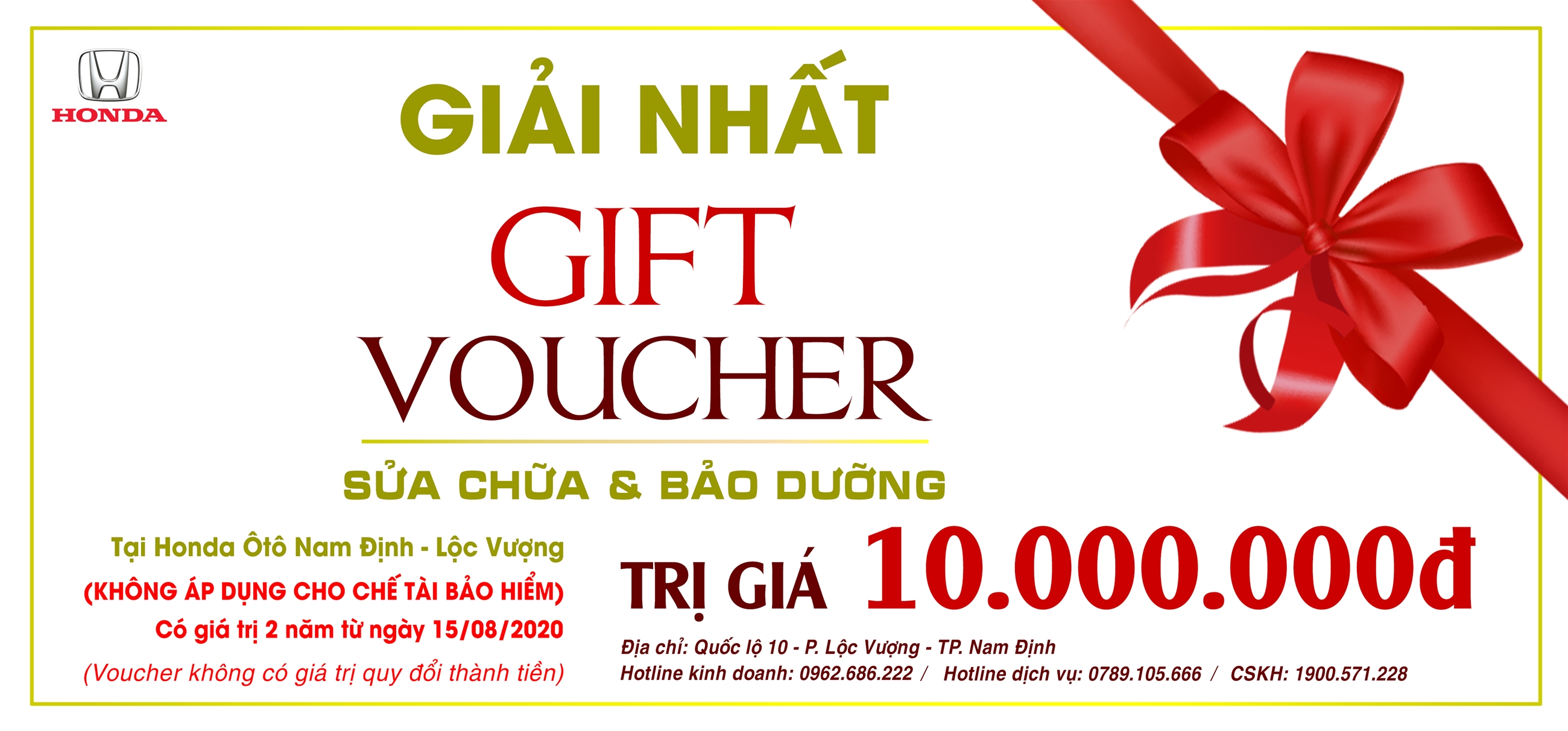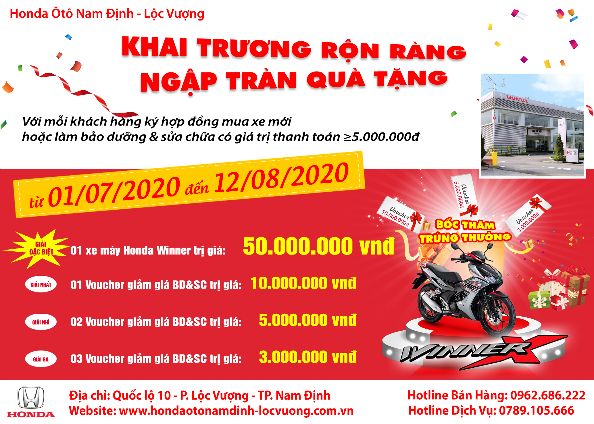 Từ ngày 01/07/2020 đến hết ngày 12/08/2020 khi khách hàng ký Hợp đồng mua xe ô tô Honda mới hoặc khách hàng đến làm bảo dưỡng & sửa chữa (BD&SC) có giá trị thanh toán ≥ 5.000.000 vnđ (trước VAT) sẽ được nhận 01 phiếu Bốc thăm trúng thưởng.