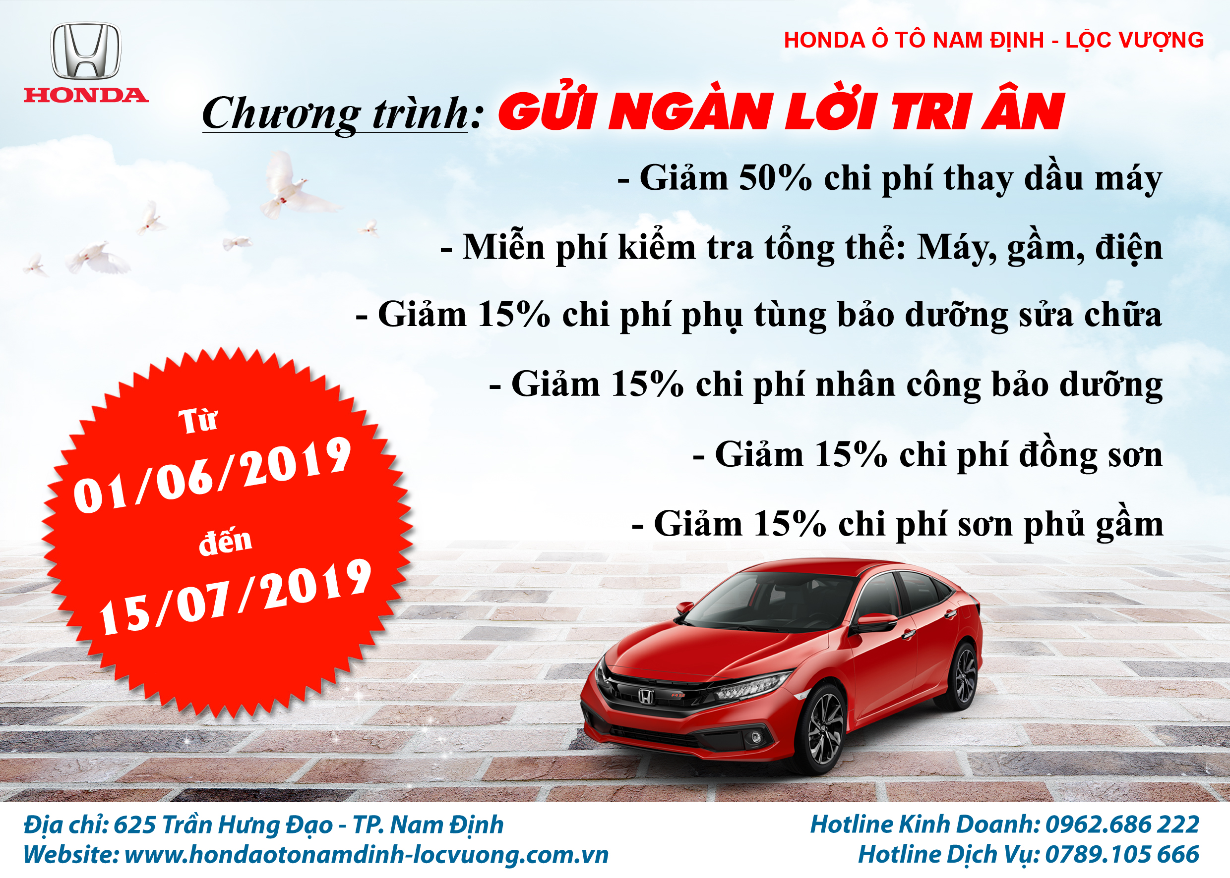 Đồng thời từ ngày 01/06/2019 đến 15/07/2019 Honda Ô tô Nam Định - Lộc Vượng cũng triển khai chương trình "Gửi ngàn lời tri ân" khi khách hàng mang xe đến làm các dịch vụ tại xưởng bao gồm: