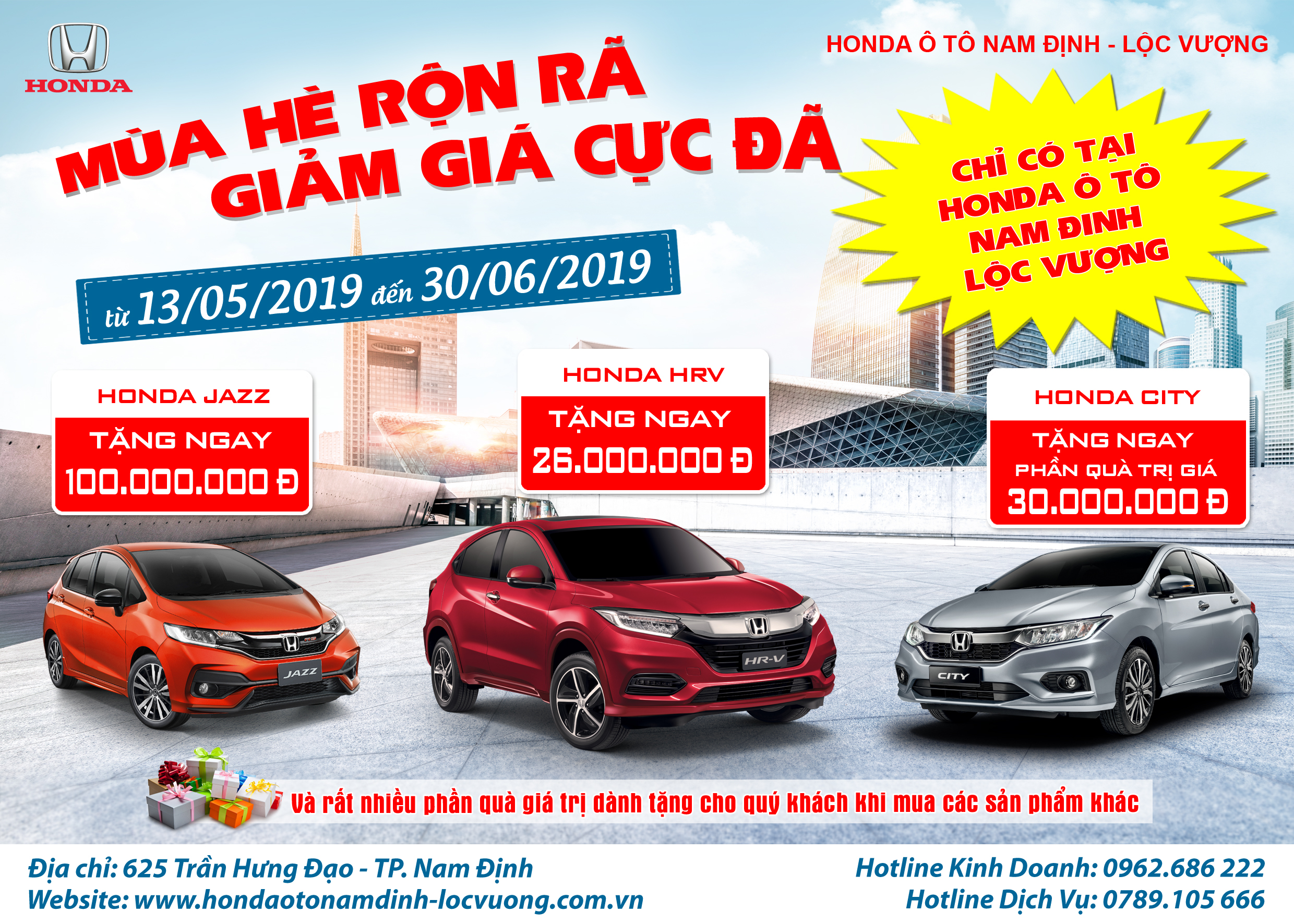 Với mong muốn nhiều hơn nữa khách hàng có cơ hội sở hữu các mẫu xe Honda và tận hưởng những khoảnh khắc mùa hè tuyệt vời bên gia đình, bạn bè. Honda Ô tô Nam Định – Lộc Vượng triển khai chương trình siêu khuyến mại hấp dẫn dành cho 3 mẫu xe Honda Jazz, Honda HRV, và Honda City cụ thể như sau: