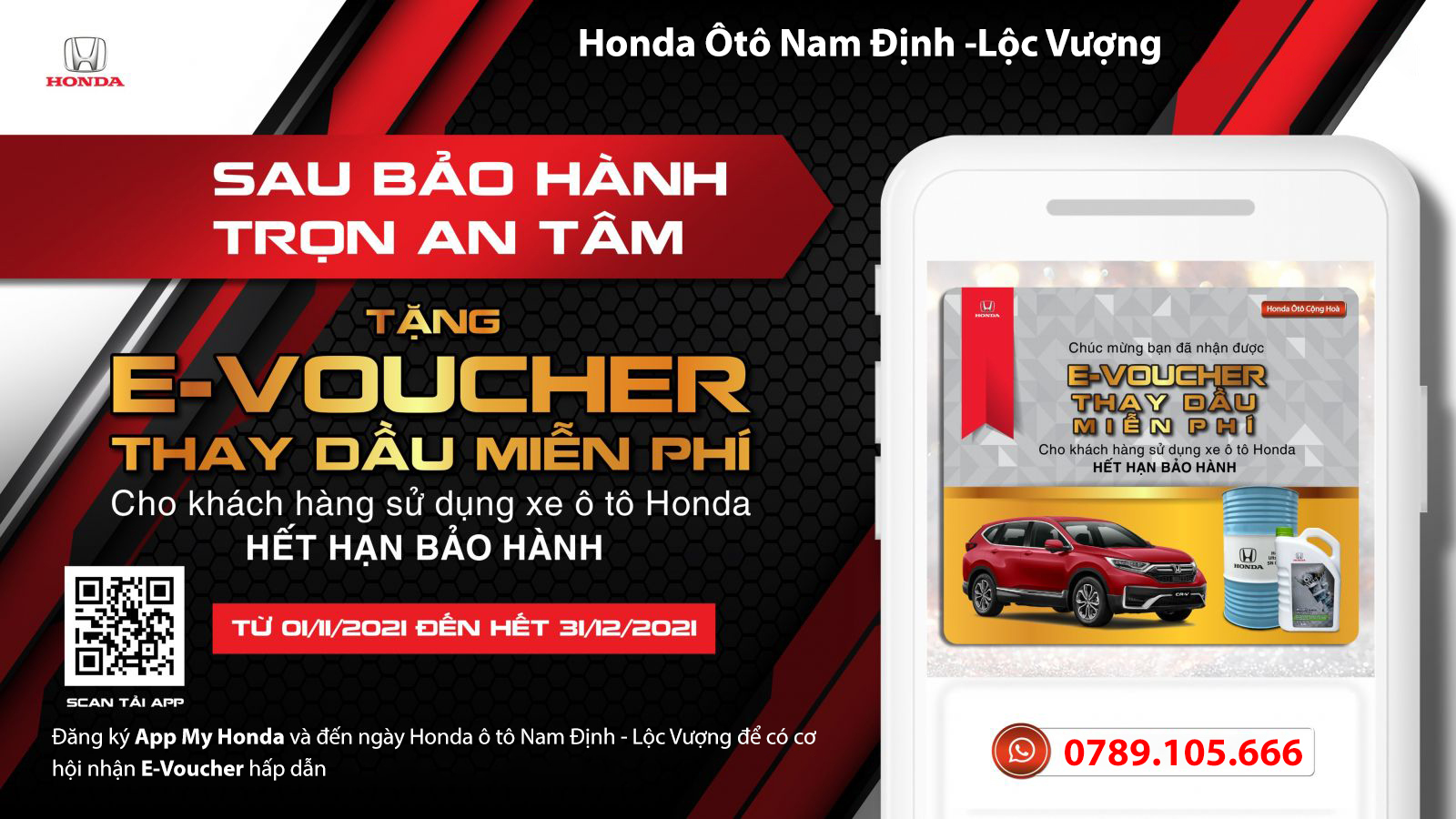3/ ĐIỀU KIỆN: Khách hàng đăng ký ứng dụng My Honda+ và đến đại lý Honda Ôtô Nam Định - Lộc Vượng làm dịch vụ với giá trị tối thiểu 2.000.000 VNĐ sẽ có cơ hội nhận ngay E-VOUCHER thay dầu miễn phí cho xe.