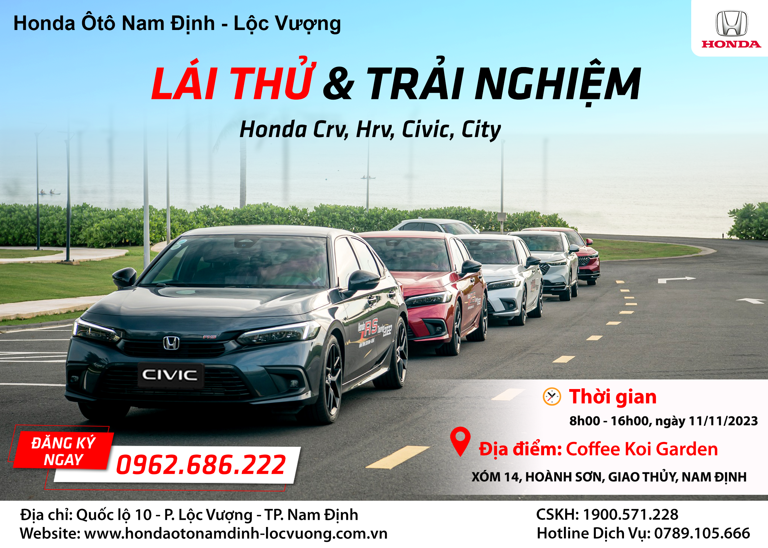 Nhằm đem lại những trải nghiệm tốt nhất cho Quý khách hàng. Honda Ôtô Nam Định - Lộc Vượng tiếp tục tổ chức Chương trình "Lái thử và Trải nghiệm" các dòng xe Ôtô Honda thế hệ mới nhất: Honda HRV, Honda CRV, Honda City, Honda Civic