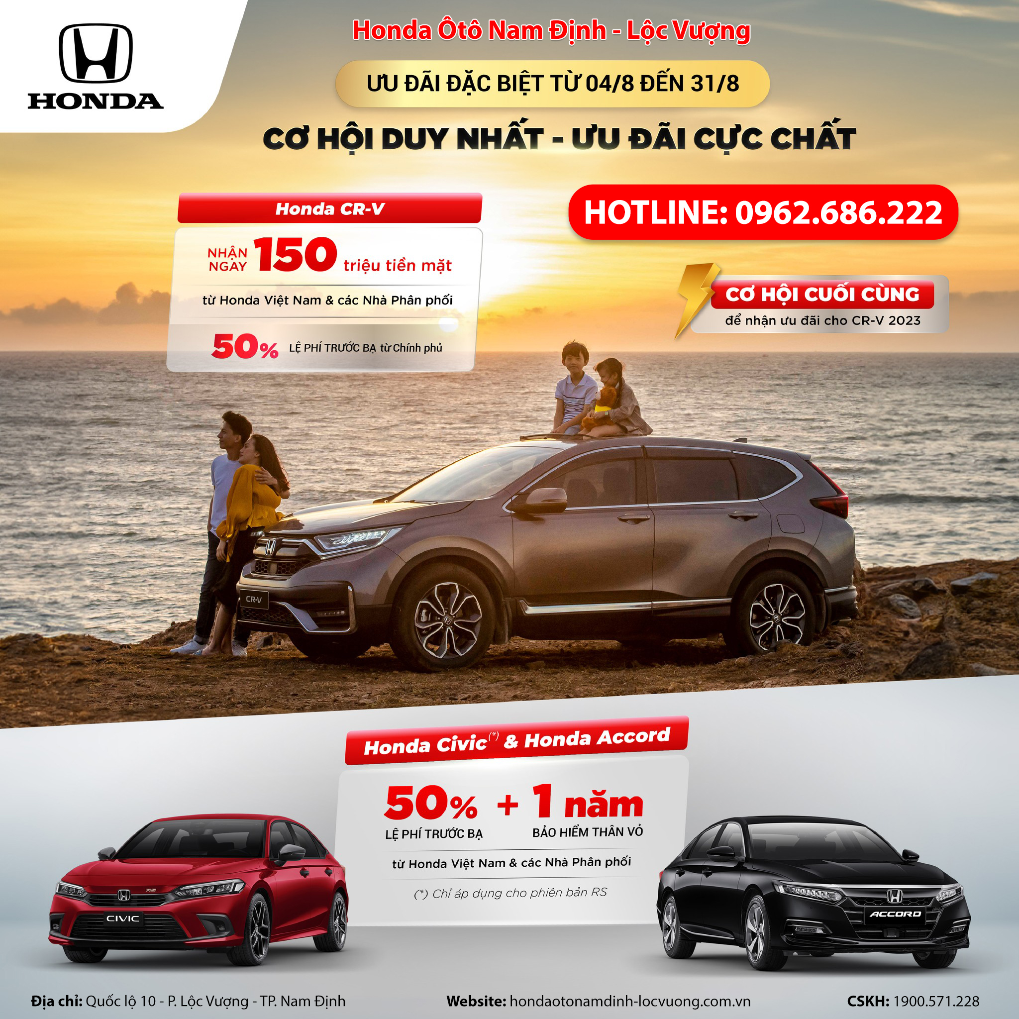 Nhằm mang đến nhiều hơn nữa cơ hội trải nghiệm các mẫu xe Honda và tận hưởng những khoảnh khắc du ngoạn tuyệt vời cho Khách hàng, từ ngày 04 đến hết ngày 31 tháng 08 năm 2023, HVN phối hợp cùng hệ thống Nhà Phân phối Ôtô Honda trên toàn quốc triển khai chương trình khuyến mại hấp dẫn “Cơ hội duy nhất nhận ưu đãi cực chất” cho Honda CR-V, Honda Civic RS và Honda Accord.