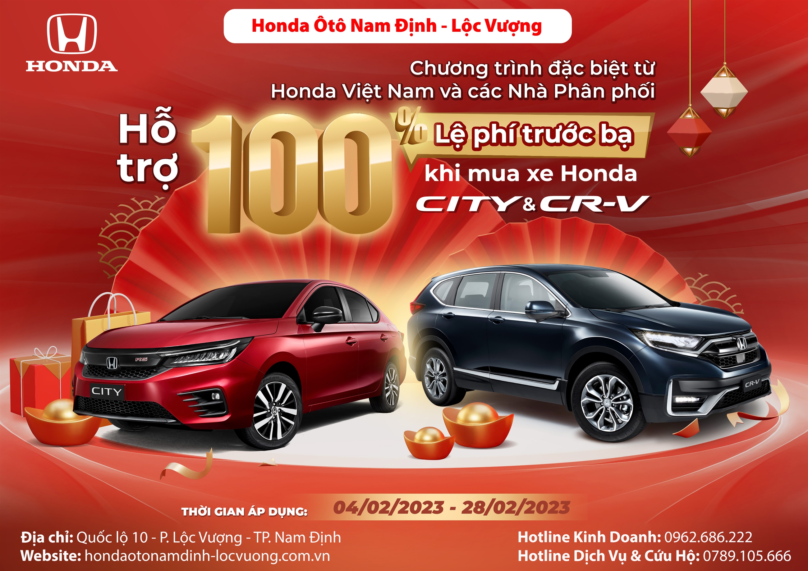 Nhằm tăng thêm cơ hội sở hữu và trải nghiệm các sản phẩm ô tô Honda đến nhiều hơn nữa khách hàng trên cả nước, đồng thời hỗ trợ một phần chi phí mua xe cho khách hàng nhân dịp đầu xuân mới 2023, từ ngày 04 đến hết ngày 28 tháng 02 năm 2023, HVN phối hợp cùng hệ thống Nhà Phân phối Ôtô Honda trên toàn quốc triển khai chương trình khuyến mại: Hỗ trợ 100% lệ phí trước bạ cho khách hàng mua xe Honda CR-V và Honda City với thông tin chi tiết như sau: