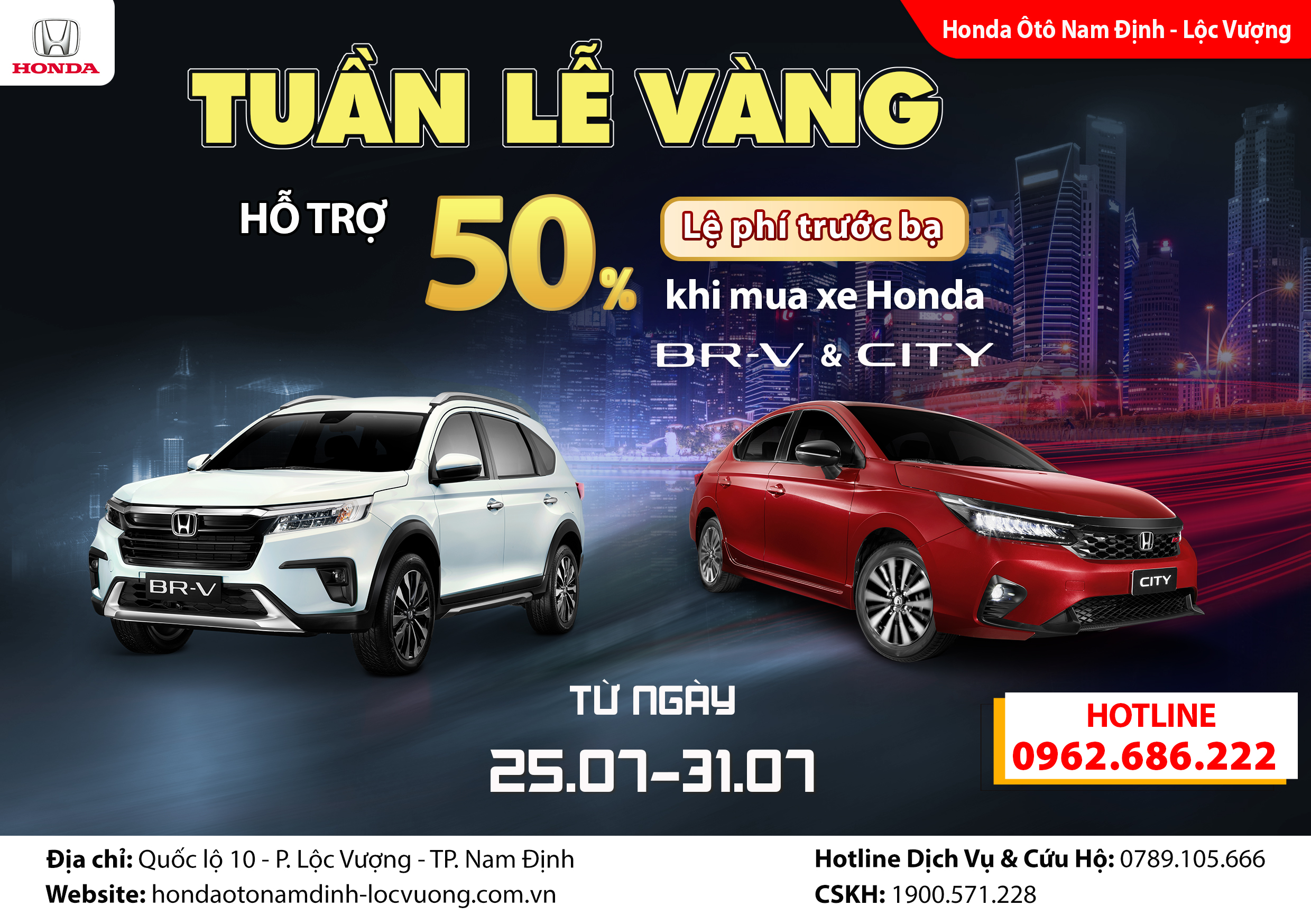 Từ 25/07 - 31/07/2023 hỗ trợ 50% Thuế trước bạ cho khách hàng ký hợp đồng Honda City & Honda Brv.
