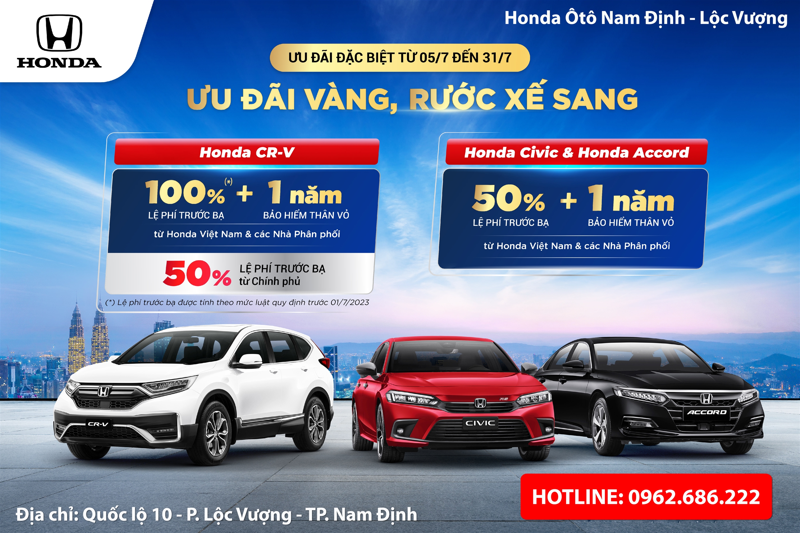 Nhằm mang đến nhiều hơn nữa cơ hội trải nghiệm các mẫu xe Honda và tận hưởng những khoảnh khắc du ngoạn tuyệt vời cho Khách hàng, từ ngày 05 đến hết ngày 31 tháng 07 năm 2023, HVN phối hợp cùng hệ thống Nhà Phân phối Ôtô Honda trên toàn quốc triển khai chương trình khuyến mại hấp dẫn “ƯU ĐÃI VÀNG, RƯỚC XẾ SANG” cho Honda CR-V, Honda Civic và Honda Accord.