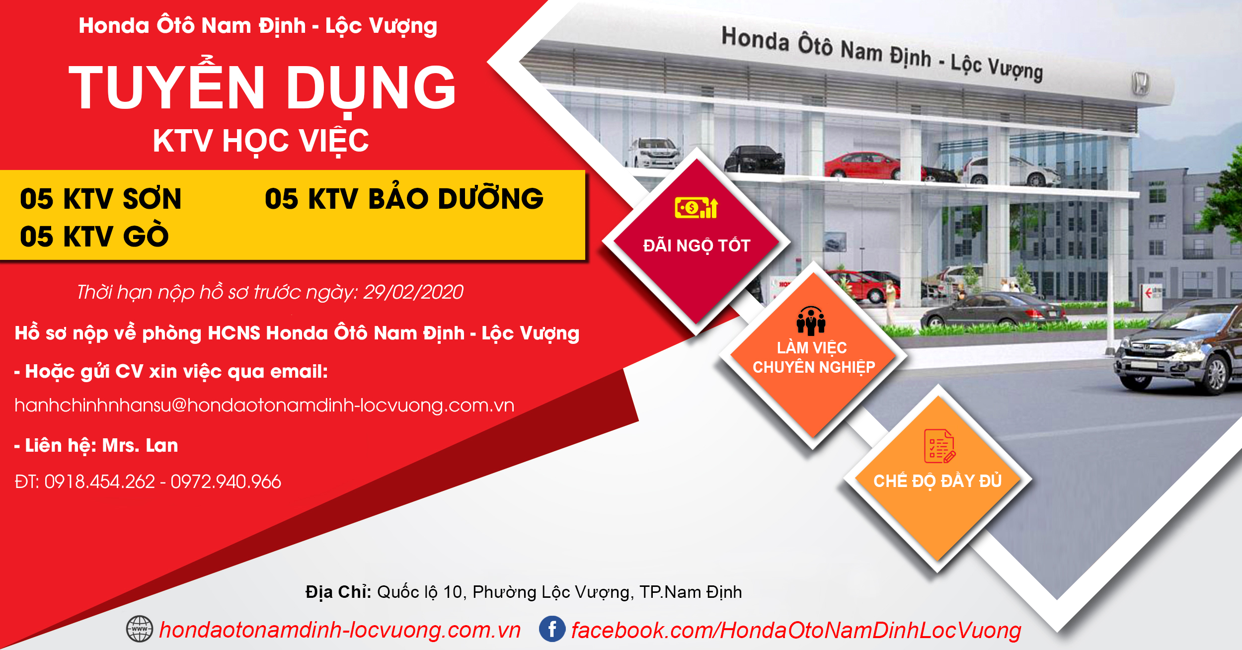 Honda Ôtô Nam Định - Lộc Vượng tuyển KTV học việc sơn, gò, bảo dưỡng